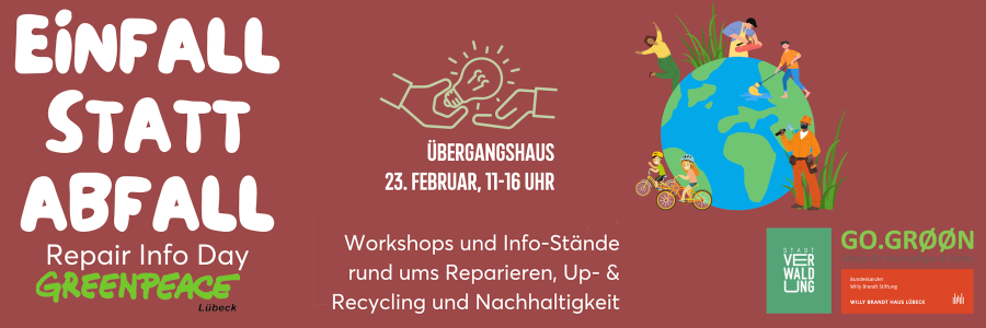 Am 23. Februar 2025 von 11:00 bis 16:00 Uhr lädt Greenpeace Lübeck gemeinsam mit LTM, der Stadtverwaltung Lübeck und GO.GRØØN zum Repair Info Day ins Übergangshaus (Königstraße 54, 23552 Lübeck) ein.