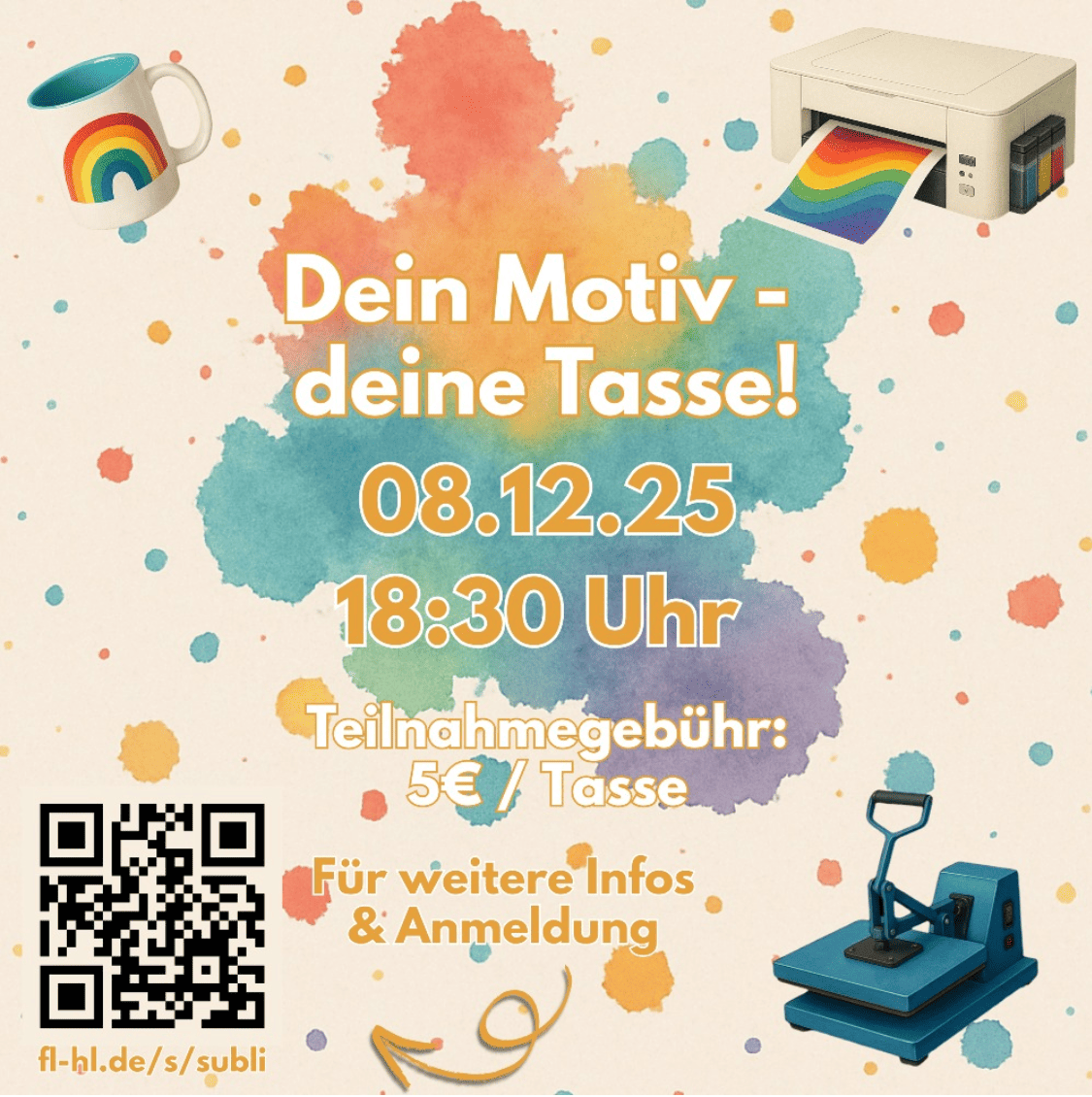 Dein Motiv - deine Tasse! Gestalte deine eigene Tasse – mit Foto, Spruch oder Wunschmotiv. Perfekt als persönliches Weihnachtsgeschenk oder als dein neues Lieblingsstück! Du bekommst eine einfache Einführung, alle Materialien sind inklusive und am Ende nimmst du deine fertig veredelte Tasse direkt mit nach Hause.